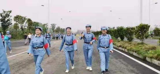 早上七点半,丰堆仑革命旧址人声鼎沸,前来参加活动的人员头戴红军帽,身着红军服,精神抖擞。学党史、唱红歌、温誓词……大家一路高歌、斗志昂扬,开始了33公里的徒步毅行。