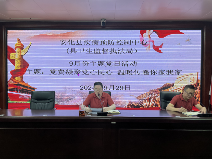 9月29日,安化县疾病预防控制中心一、二支部联合开展了9月份主题党日活动。活动主题为“党费凝聚党心民心,温暖传递你家我家”。活动议程丰富多样,涵盖了多个重要学习内容,包括学习二十届三中全会辅导百问相关内容、习近平总书记防汛救灾重要指示体现党费的作用、《中国共产党组织工作条例》以及统计工作相关资料等。同时,还重温了入党誓词,观看了教育视频,进行了党纪学习教育工作总结。