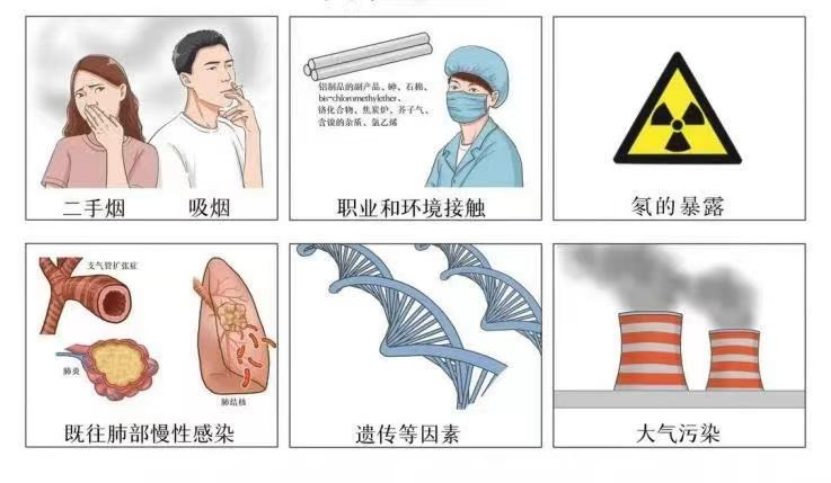 有些职业工作中存在致癌因子,比如:石棉、砷、芥子气以及铀、镭等放射性物质衰变产生的惰性气体,电离辐射和微波辐射等。这些危险因素可使肺癌的危险性增加3-30倍。
