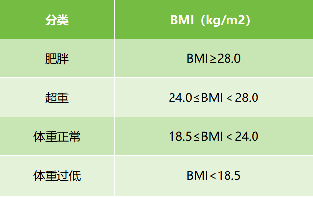 体重变化是判断一段时期内能量平衡与否最简便易行的指标,也是判断吃动是否平衡的指标。目前常用的判断健康体重的指标是体质指数(body mass index,BMI),它的计算方法是用体重(kg)除以身高(m)的平方。我国健康成年人(18~64 岁)的 BMI 应在 18.5~23.9 kg/m2,65岁以上老年人的适宜体重和BMI应该略高(20~26.9kg/m2)。