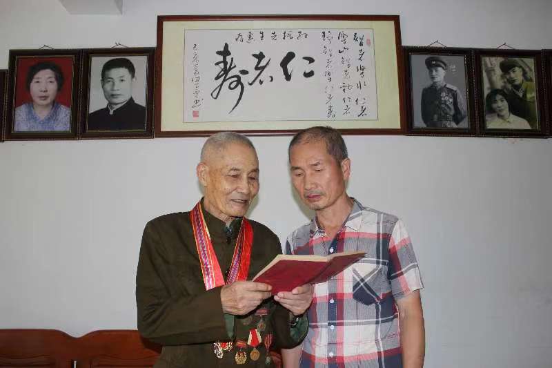 老战士孙振对照《毛泽东选集》正在给儿子孙湘龙讲述战斗历史