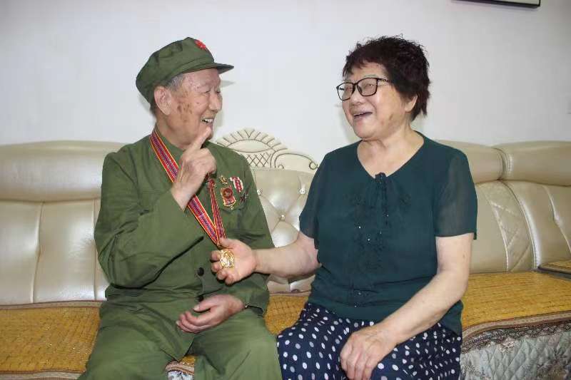老战士罗仪正在给妻子曾学芳讲述战斗胜利的喜悦