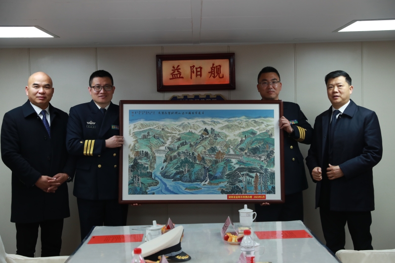 祁辉一行代表益阳市委、市政府向益阳舰捐赠了益阳著名画家史一墨先生创作的瓷板画《安化茶山印象》、梁瑞光先生创作的山水画《春和景明》以及益阳市党史办出版的益阳红色党史书籍,并与益阳舰官兵座谈交流。