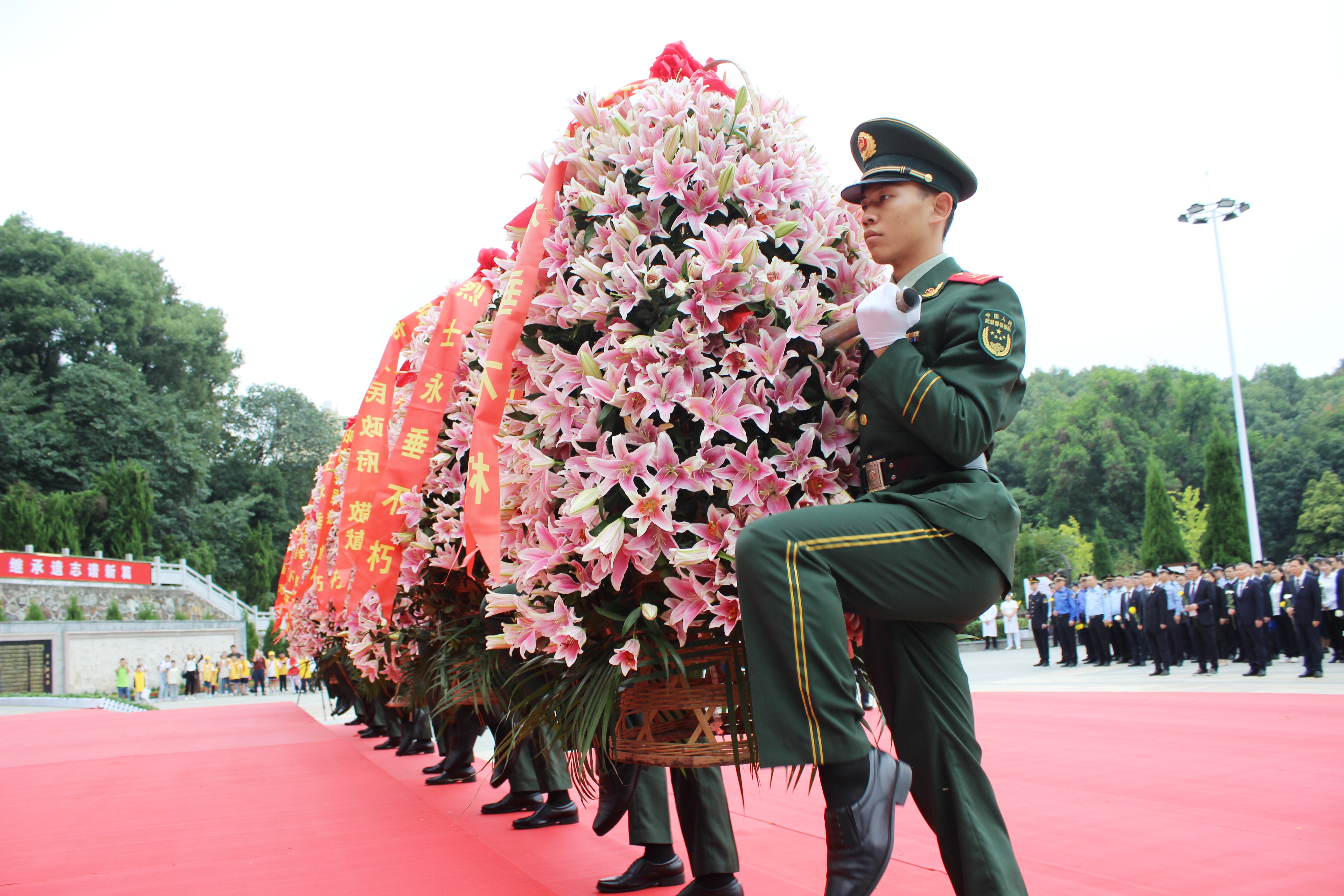 由中共益阳市委,市人大常委会,市政府,市政协,益阳军分区,益阳市人民团体和各界群众敬献的6只大型花篮在广场上整齐排开,红色缎带上“烈士永垂不朽”几个金色大字熠熠生辉。深情的《献花曲》中,礼兵稳稳抬起花篮,缓缓走向烈士纪念碑,将花篮敬放在纪念碑前,表达对革命先烈的深切缅怀和崇高敬意。
