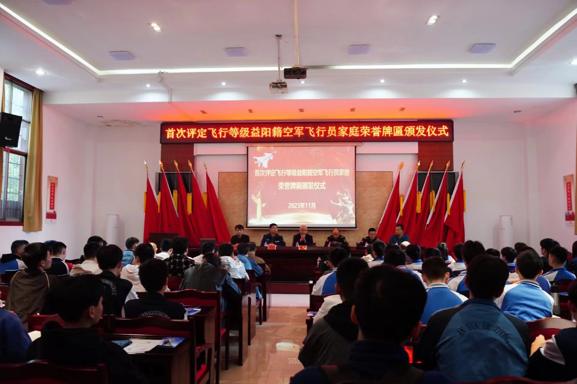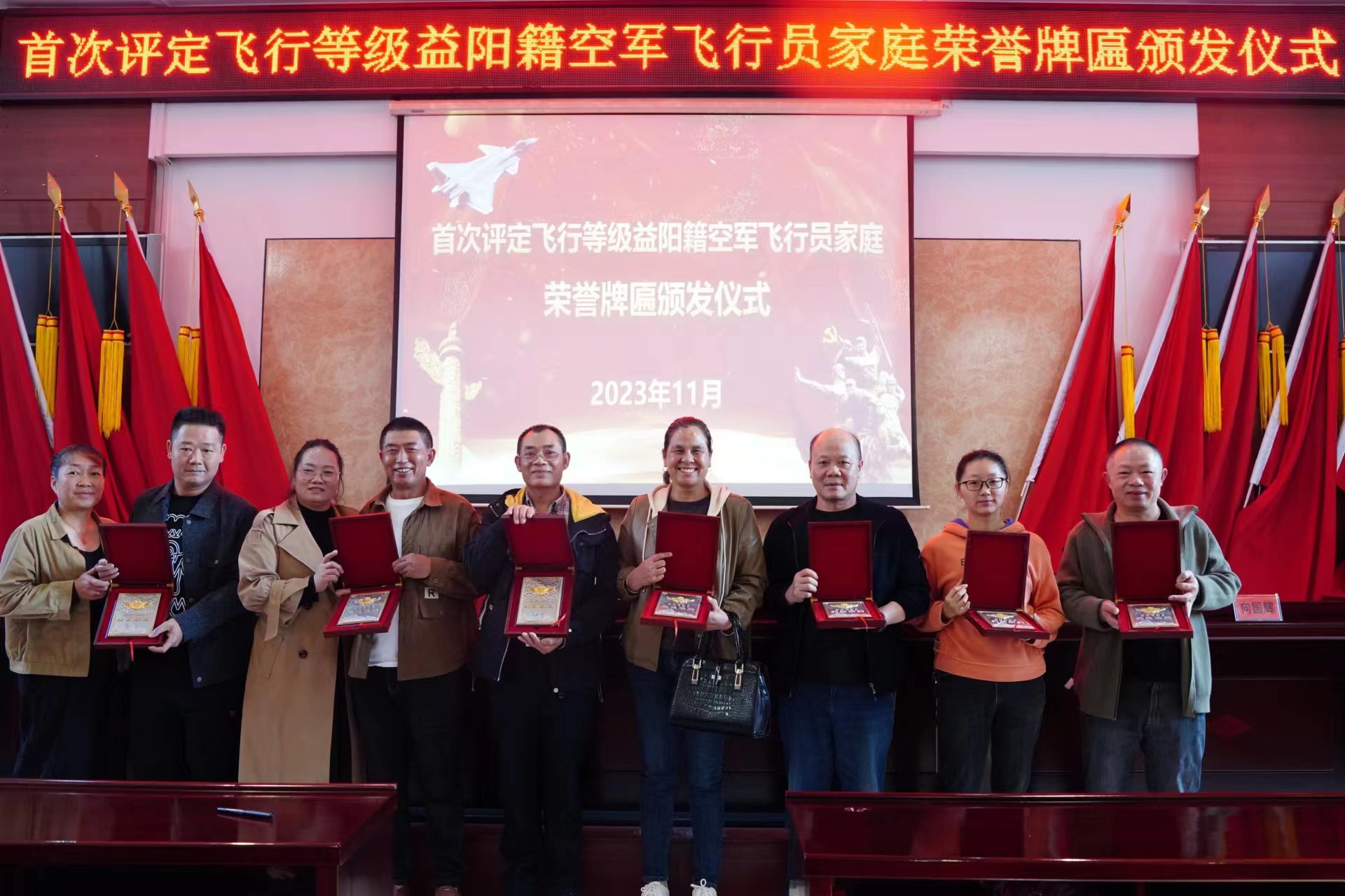 11月7日,首次评定飞行等级的8名益阳籍空军飞行员家庭荣誉牌匾颁发仪式在箴言中学举行。