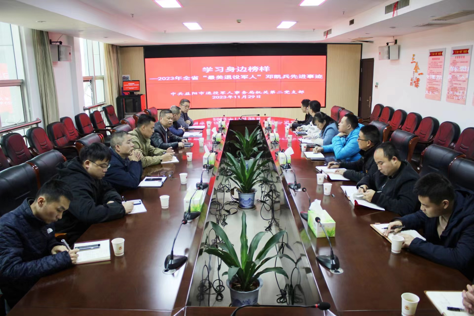 第二批主题教育开展以来,市退役军人事务局按照“思想政治坚定、实绩业绩突出、品德休养良好、社会群众认可”的原则,推荐邓凯兵参评并获得2023年度湖南省“最美退役军人”称号。并以全省“最美退役军人”发布仪式为契机,结合“学习身边榜样”活动,深入学习贯彻习近平新时代中国特色社会主义思想和习近平总书记关于退役军人工作重要论述以及关于湖南工作重要讲话和指示批示精神,加强退役军人思想政治引领,在全市退役军人事务系统组织开展学习宣传活动,掀起学习先进、宣传先进、争当先进的热潮,为全面建设现代化新益阳贡献退役军人力量。
