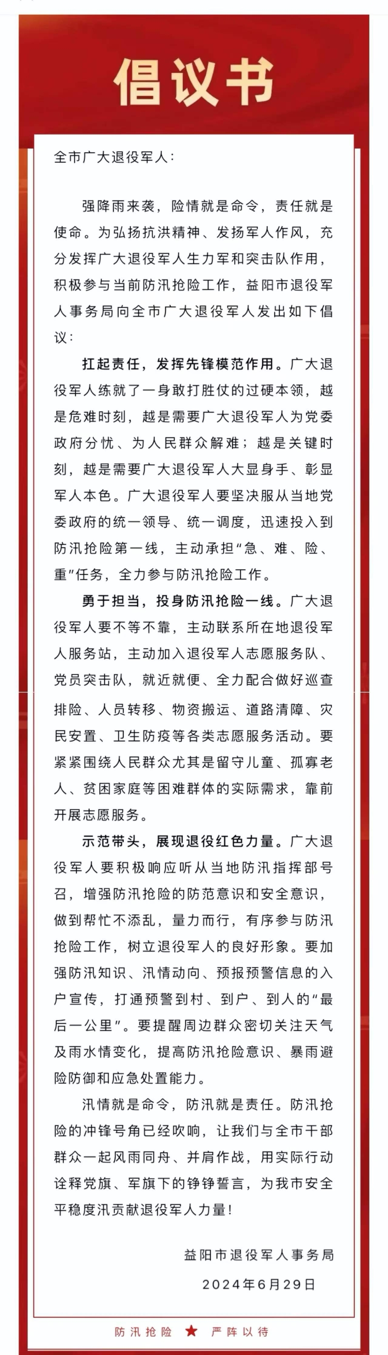@益阳市广大退役军人,这份防汛倡议书请查收!