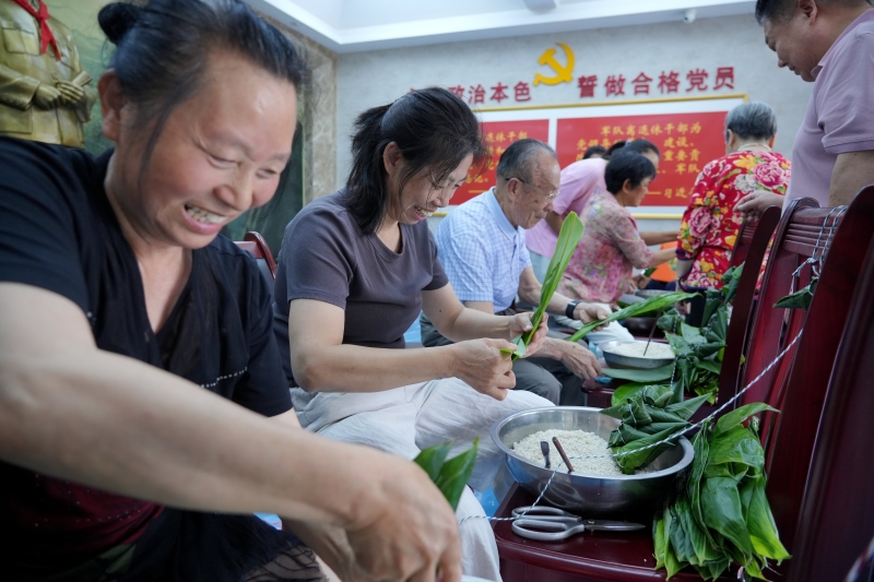 5月27日,益阳市团圆军休所办公楼一楼大厅内粽香四溢,40多位军休干部和家属围坐一堂,在欢声笑语中包粽子、话家常。