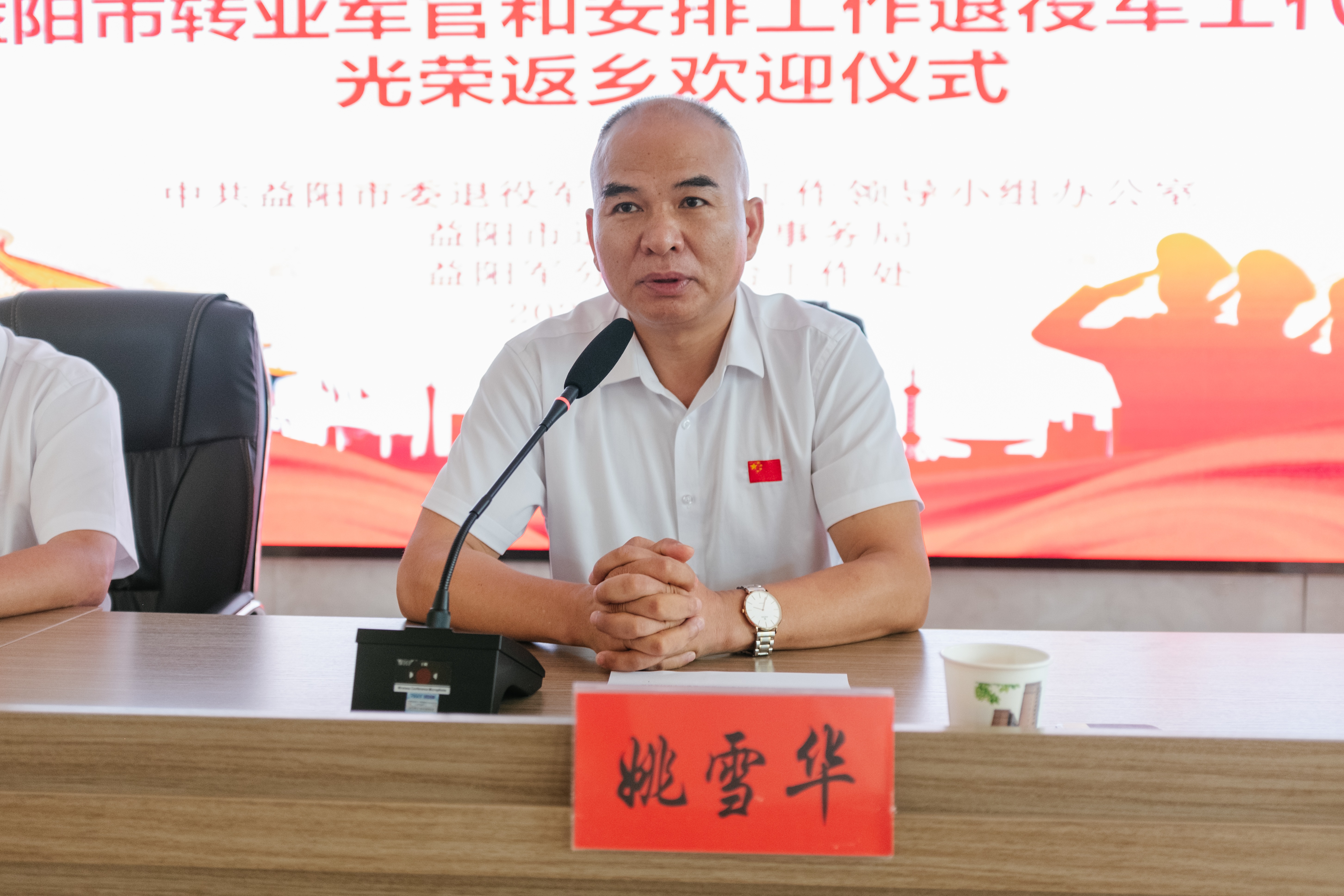 中共益阳市委退役军人事务工作领导小组办公室主任、市退役军人事务局党组书记、局长姚雪华在讲话中强调,市委、市政府高度重视退役军人安置和服务保障工作。市退役军人事务局作为大家的“娘家”,将始终秉持“满腔热忱为退役军人服务”的工作理念,坚决贯彻落实上级关于退役军人工作的各项决策部署,在移交安置上力求“精准高效”,在服务保障上力求“贴心暖心”,在作用发挥上搭建“广阔平台”,努力让大家感受到家乡的温暖和组织的关怀。