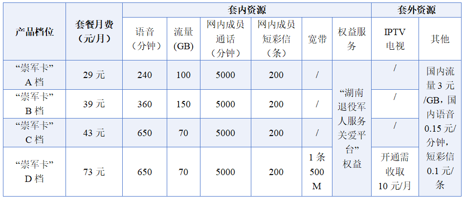 “崇军卡”设置A、B、C、D四款专属套餐,具体资费内容如下: