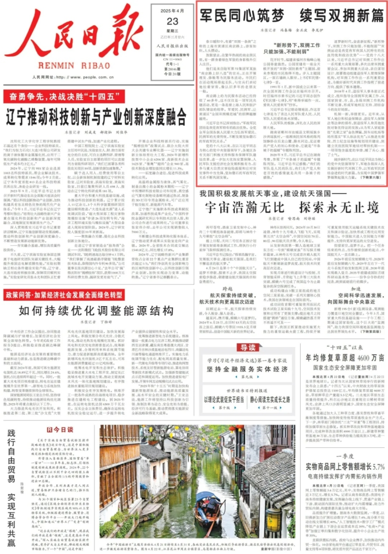 4月23日,人民日报头版刊登“军民同心筑梦 续写双拥新篇”综述文章。