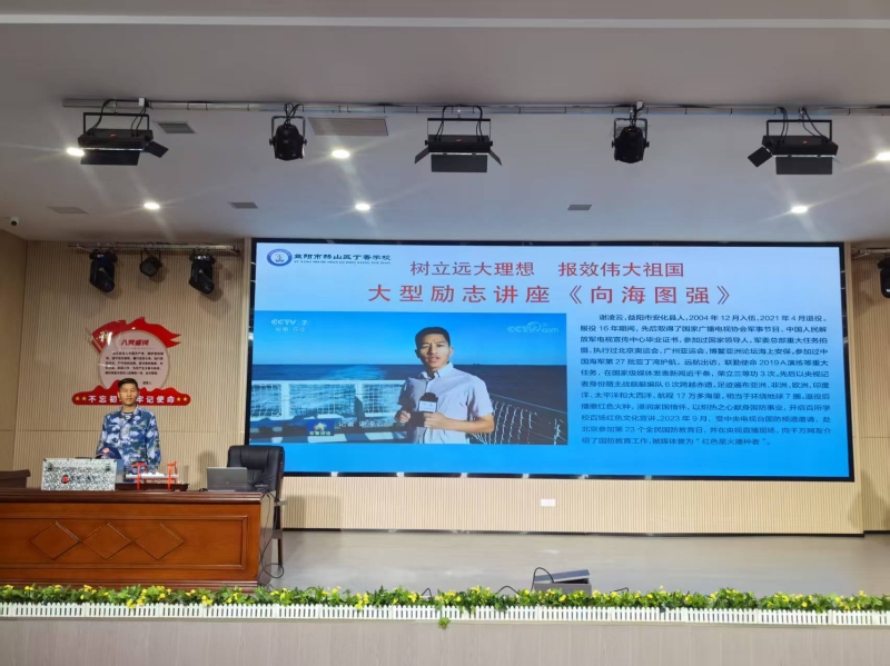 2022年9月开始,他走进校园开展励志演讲,把自己16年的军旅经历转化为国防教育,将入伍初心、成长经历、护航故事、舰艇模型带入课堂。2023年9月,还作为湖南省唯一的海军退役军人代表,受邀到北京参加央视组织的第23个全民国防教育日。截至目前,他的足迹已遍布全市10个乡镇20所学校,将“深蓝”国防梦想的种子,播撒在无数少年心中。
