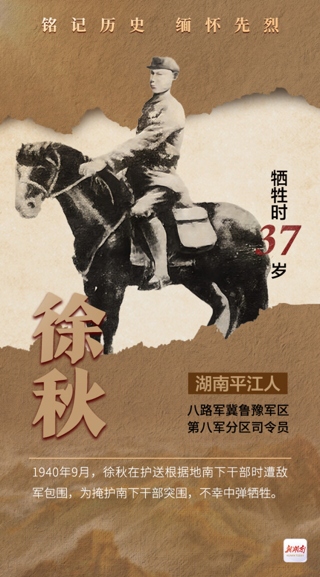24岁在平江参加革命,长征途中渡乌江、翻雪山、过草地,又从陕北转战山东抗击日寇,直至37岁血洒山东郓城壮烈牺牲,抗战英烈徐秋用宝贵生命书写了一曲不朽的英雄赞歌。