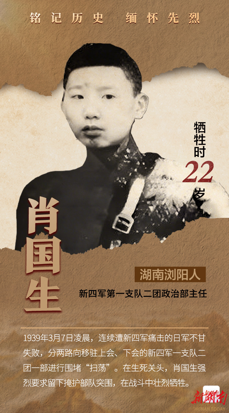 肖国生(又作萧国生),1916年5月出生于湖南省浏阳县淳口镇杨柳村。1930年,年仅14岁的肖国生毅然背起竹筒枪参加红军,于1933年加入中国共产党。