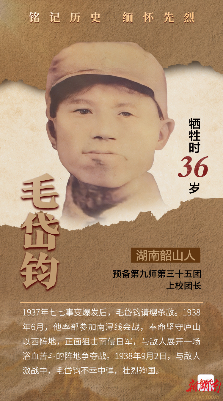 9月2日,朱家山阵地战斗异常惨烈。日军借助飞机、重炮和催泪瓦斯发起亡命冲锋。危急关头,毛岱钧冲出团指挥所,亲率参谋、传令兵、勤务兵和少量预备队,与敌人展开白刃格斗,毙敌少尉井二广喜及士兵30余人。激战中,毛岱钧不幸中弹,壮烈殉国,年仅36岁。