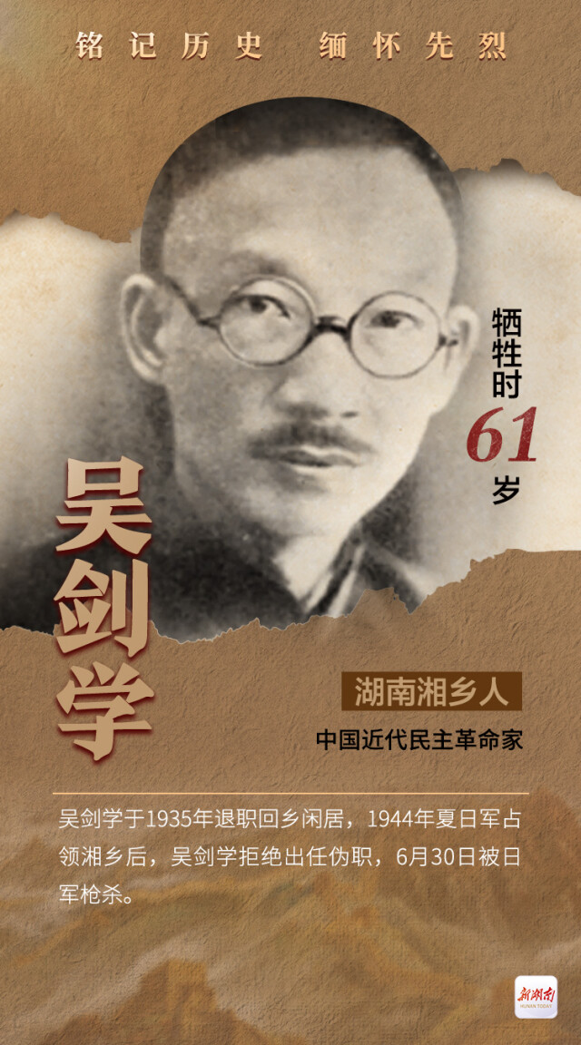 2015年,民政部公布的第二批600名著名抗日英烈和英雄群体名录中,吴剑学名列其中。这位湘中英烈在面对外敌入侵、国土沦丧的危难时刻,始终坚守着信仰和底线,用生命捍卫了民族的尊严和气节,构筑起一座不朽的精神丰碑。