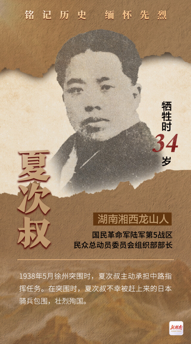 日军在台儿庄惨遭失败后,集中两个师气势汹汹地进攻徐州。1938年5月18日,李宗仁部奉命放弃徐州,夏次叔主动承担中路指挥任务。在突围时,夏次叔不幸被赶上来的日本骑兵包围,壮烈殉国,时年34岁。