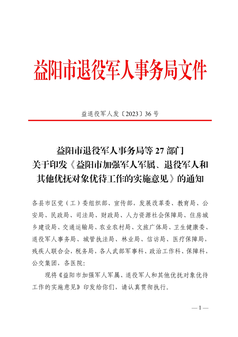 益阳市退役军人事务局等27部门关于印发《益阳市加强军人军属、退役军人和其他优抚对象优待工作的实施意见》的通知
