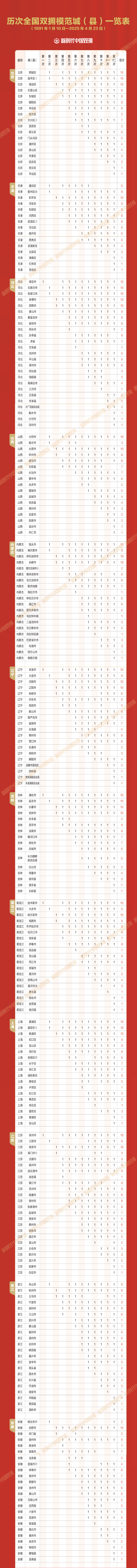 全国双拥模范城(县)创建活动,是弘扬双拥优良传统、做好双拥工作的重要载体,是密切军政军民关系、促进军民融合深度发展,推动双拥工作更好服务党和国家工作大局、国防和军队建设全局的有效途径。全国双拥模范城(县)创建活动自1991年开展以来,已经进行了12轮命名表彰。2025年新一批双拥模范城(县)已经公布,为进一步做好双拥工作,激发军地各级和广大军民参与双拥工作的热情,我们将历次受表彰城(县)集纳成表,并正式对外发布。