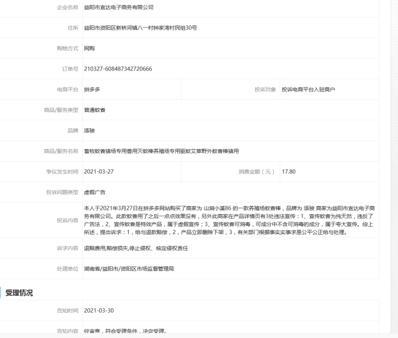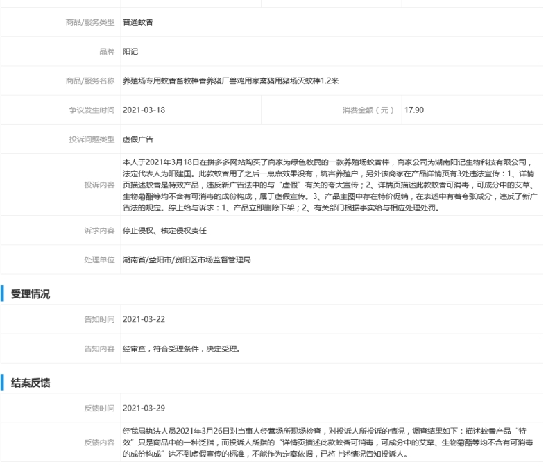 | 回复内容: | 关于对“蚊香棒质量问题”等有关投诉的回复 您好,关于您反映的“拼多多网站购买了商家为山涧小溪86蚊香棒...一点点效果没有”“资阳区市场管理局袒护商户”等问题,属于市场经营和交易中存在的问题。根据《三定方案》,益阳市发展和改革委员会确无相关职能。建议您向具有市场监管职权的有关部门反映情况。在此感谢。
