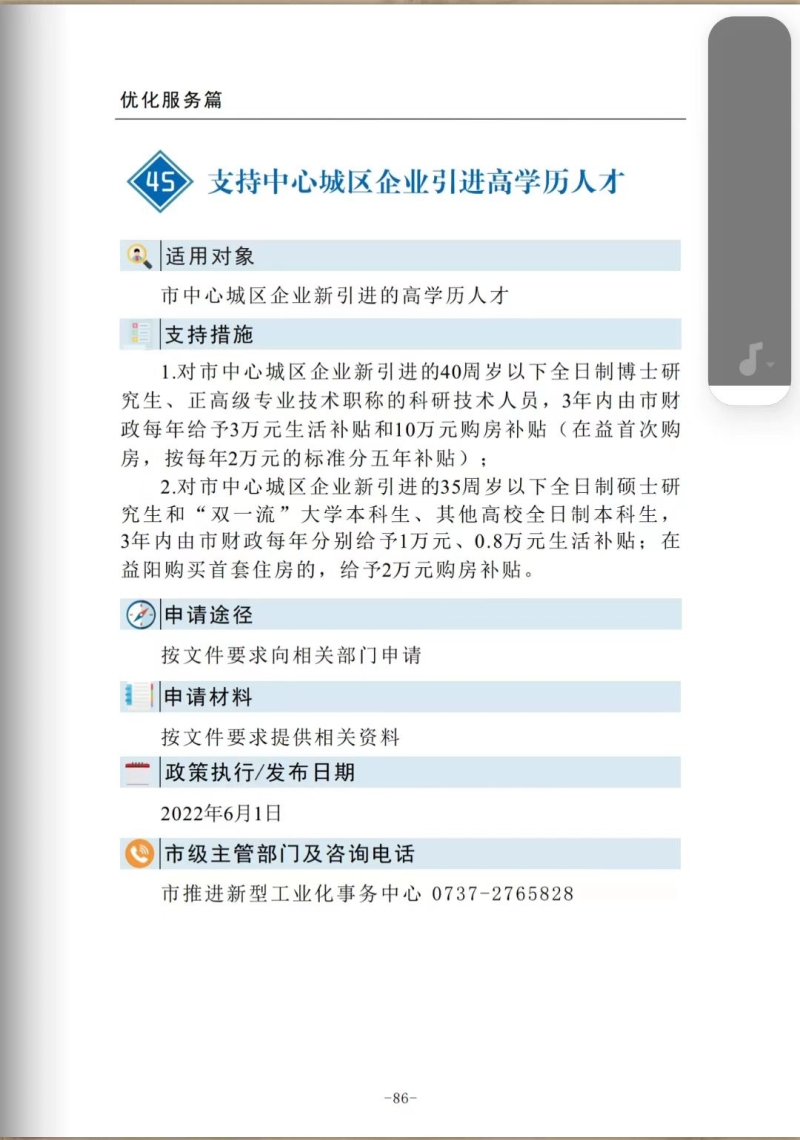 尊敬的领导,您好: 我是我市城区某企业的员工,近期在网上看到由益阳市实施“全省万名干部联完企‘送政策、解难题、优服务’行动”领导小组办公室发布的《益阳市惠企政策口袋书》中第45条中提到“支持中心城区企业引进高学历人才”,但是申请途径和申请材料要求没有明确。因为上面留的市级主管部门为贵局的推进新型工业化事务中心,因此想咨询下具体的操作流程是什么。谢谢! |