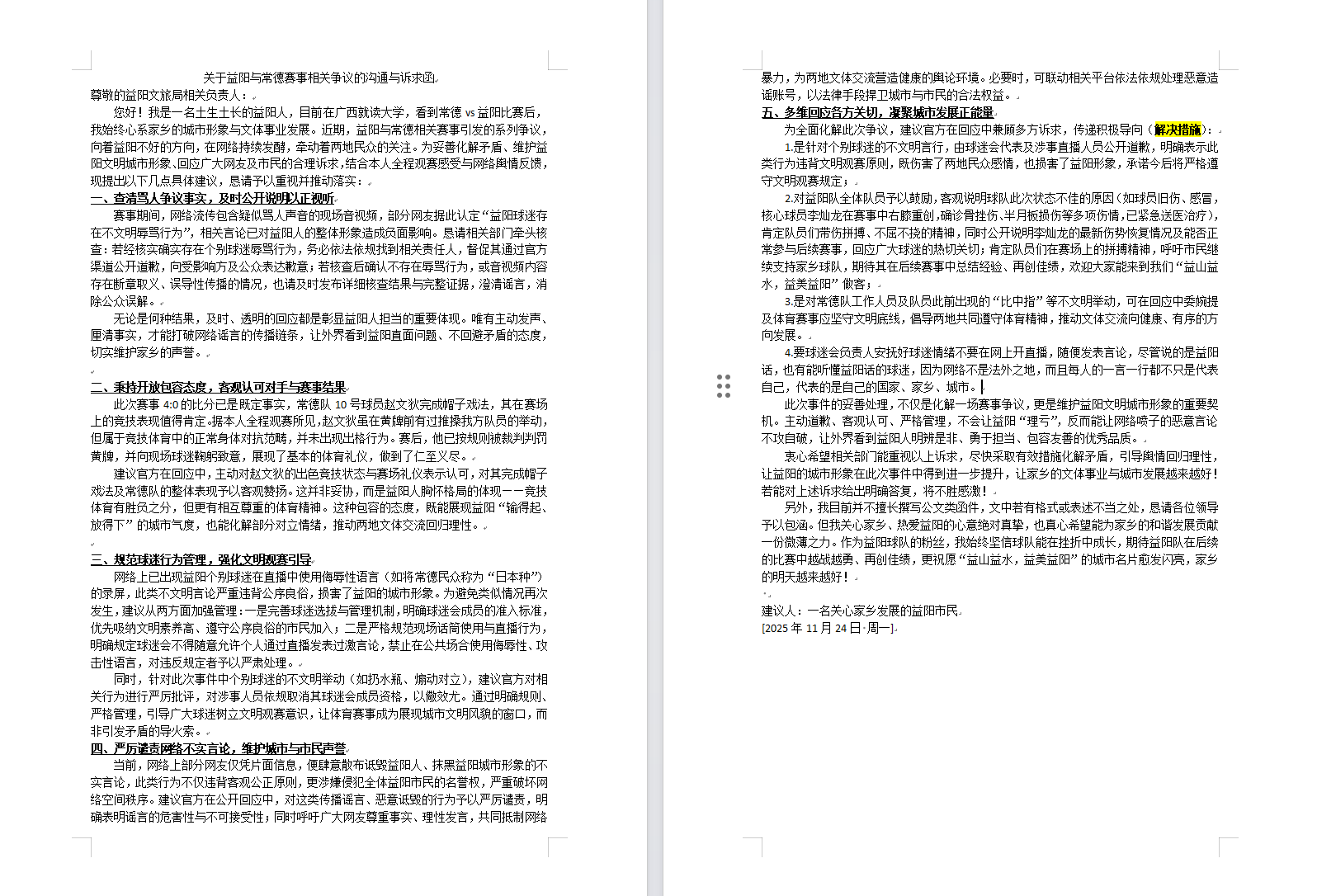 您好!我是一名土生土长的益阳人,也是益阳球队的忠实粉丝,始终心系家乡的城市形象、文体事业发展与球队的成长进步。近期,益阳与常德相关赛事引发的系列争议在网络持续发酵,牵动着两地民众的关注。为妥善化解矛盾、维护益阳文明城市形象、回应广大网友及市民的合理诉求,结合本人全程观赛感受与网络舆情反馈,现提出以下几点具体建议,恳请予以重视并推动落实(详情请见附件)