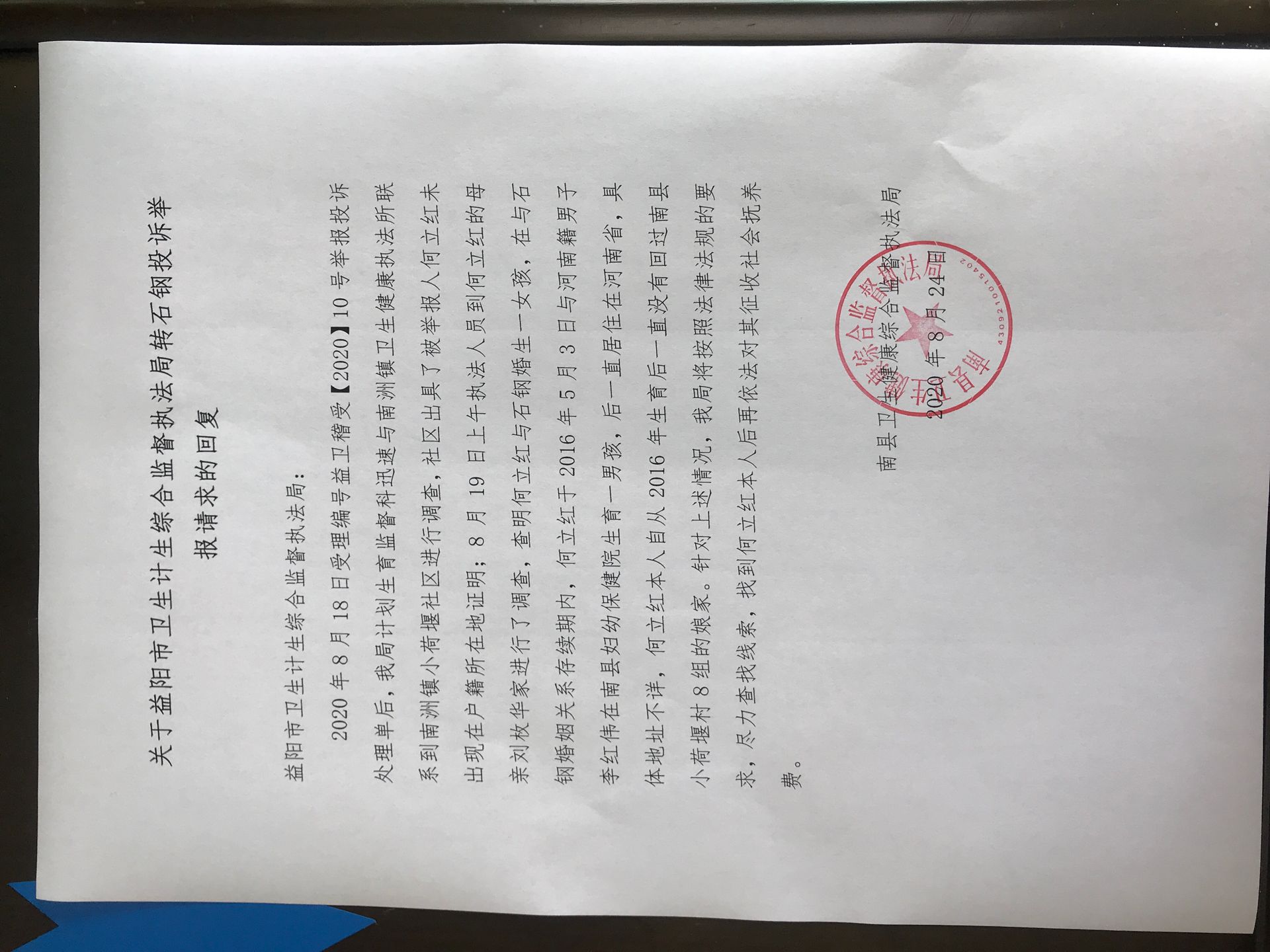 | 回复内容: | 石钢先生: 您好! “关于何丽红、李红伟二人违法重婚生育一子的实名举报”情况与2020年8月17日现场举报(书面举报)内容基本相同,并与您电话核实,我局已于2020年8月17日受理,并于2020年8月18日移交(转办)南县卫生健康综合监督执法局调查处理。 南县卫生健康综合监督执法局已于8月24日对调查情况进行了回复,并将按照法律法规的要求进一步调查处理。 附件:南县卫生健康综合监督执法局关于益阳市卫生计生综合监督执法局转石钢投诉举报请求的回复 益阳市卫生计生综合监督执法局 2020年8月24日
