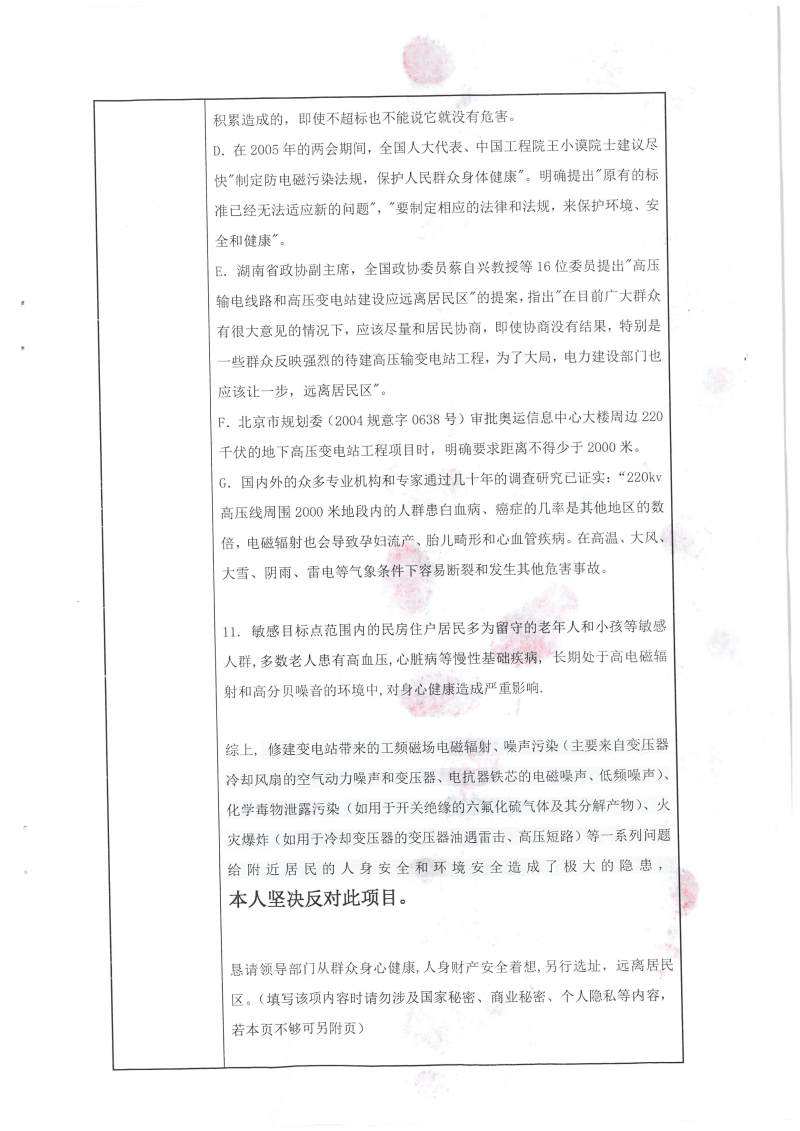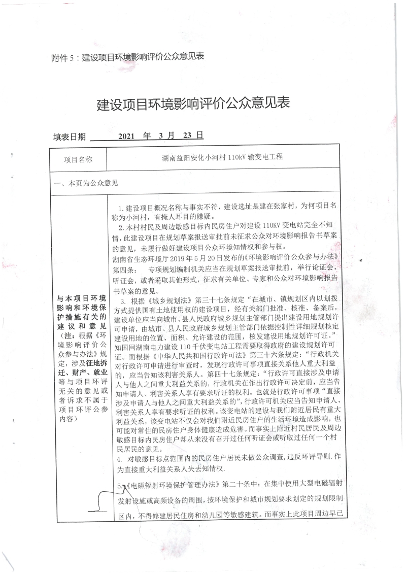 - 标题《湖南益阳安化小河村110kV输变电工程》民众意见书