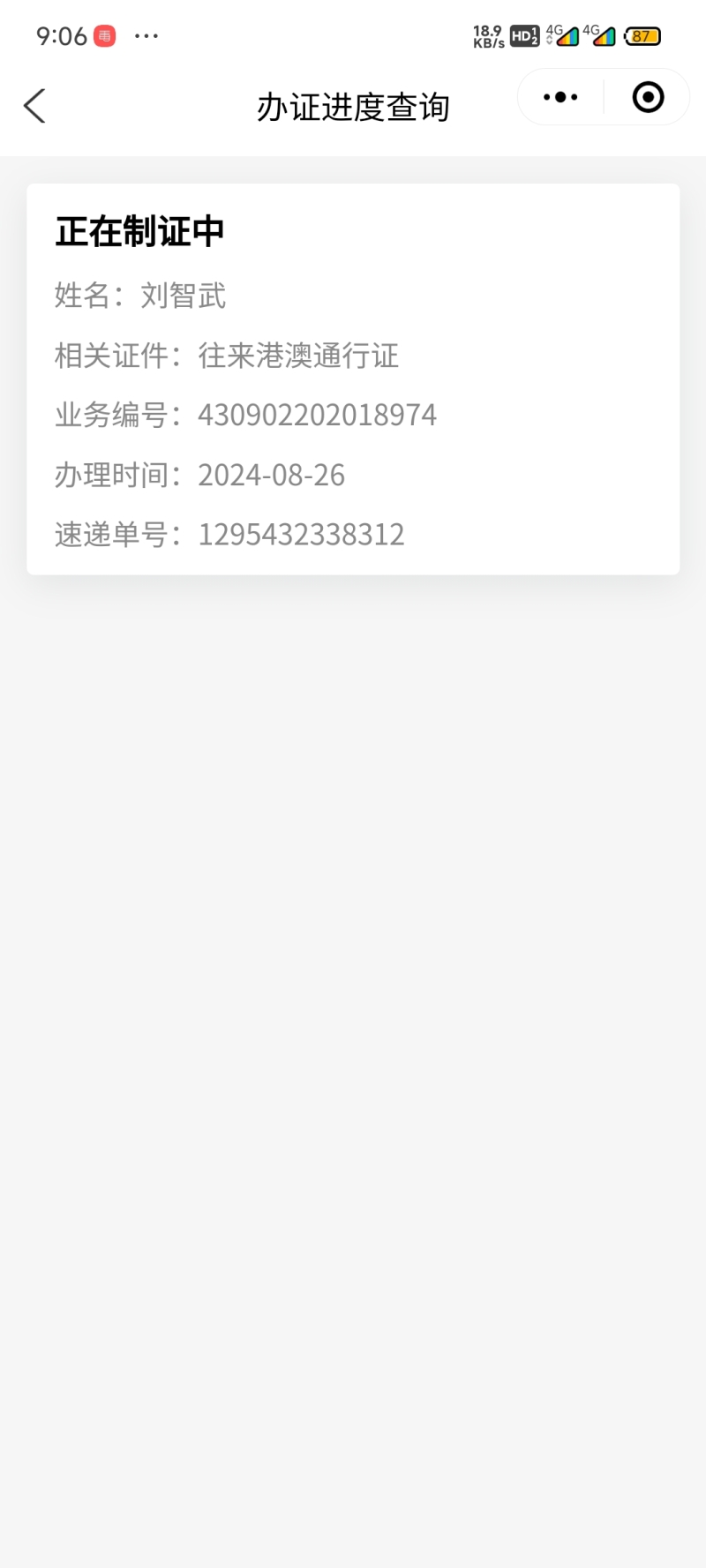 您于8月26日申请办理的港澳通行证,目前已完成制证,并于8月30日通过邮政进行投递,请您关注物流信息及时取件。