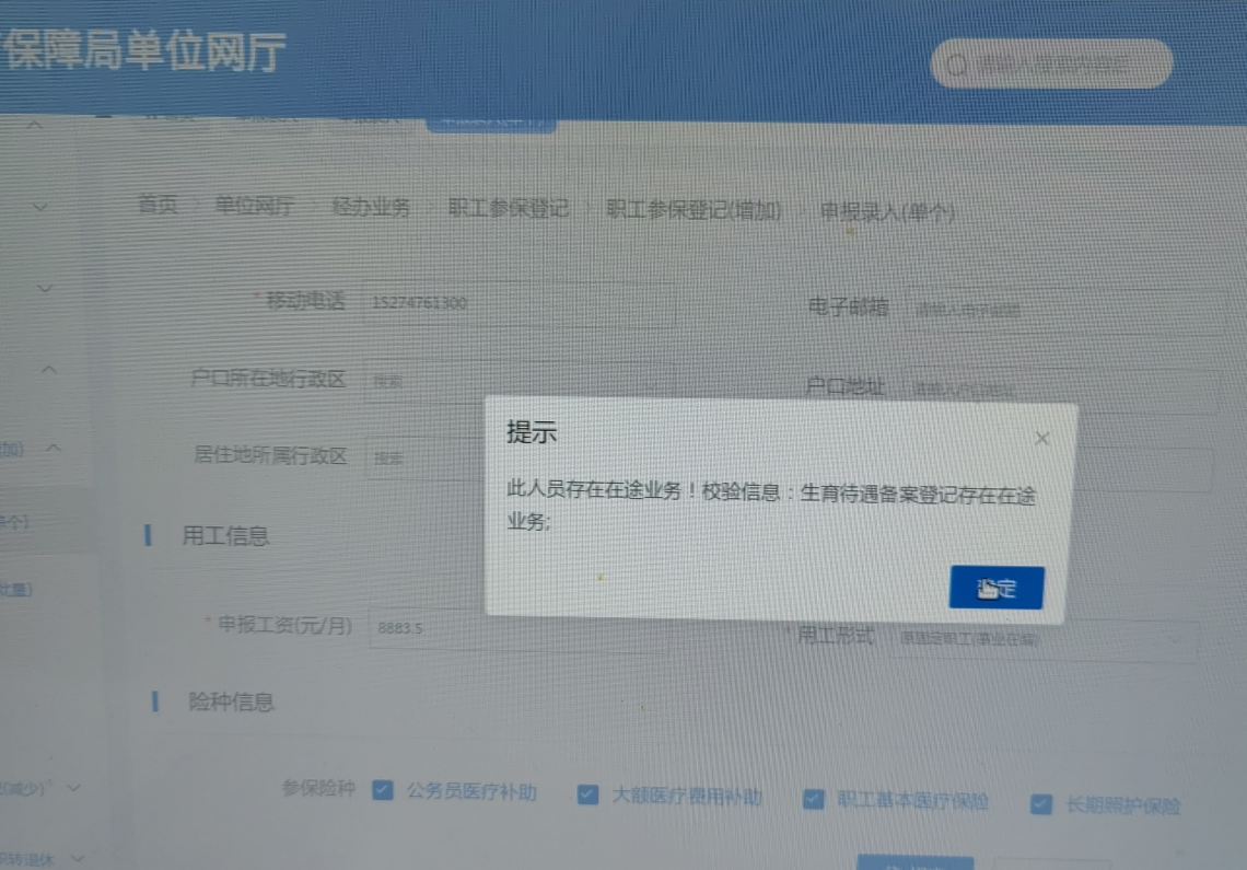 我之前在益阳安化工作,在这边缴纳了五险一金,于2022年4月转到湘潭工作,但湘潭这边一直无法帮我缴纳医保,四处寻原因,发现提示如附件:“此人员存在在途业务!校验信息:生育待遇备案登记存在在途业务;”请问现在我要怎么操作,才能在新单位缴纳医保呢?