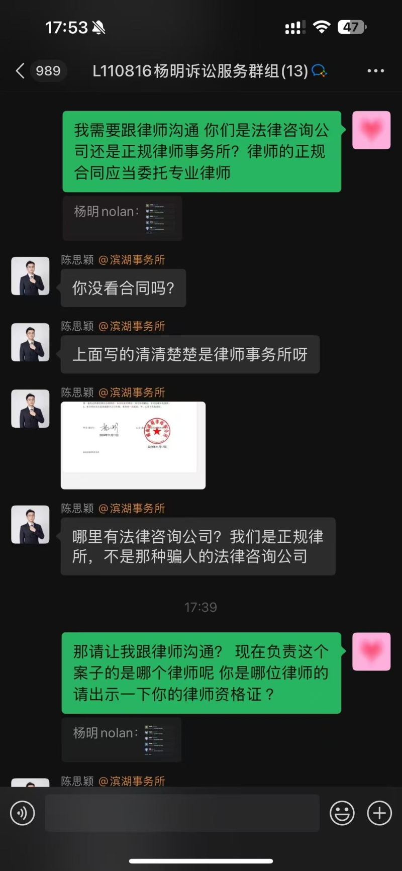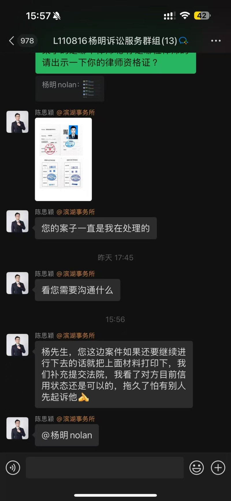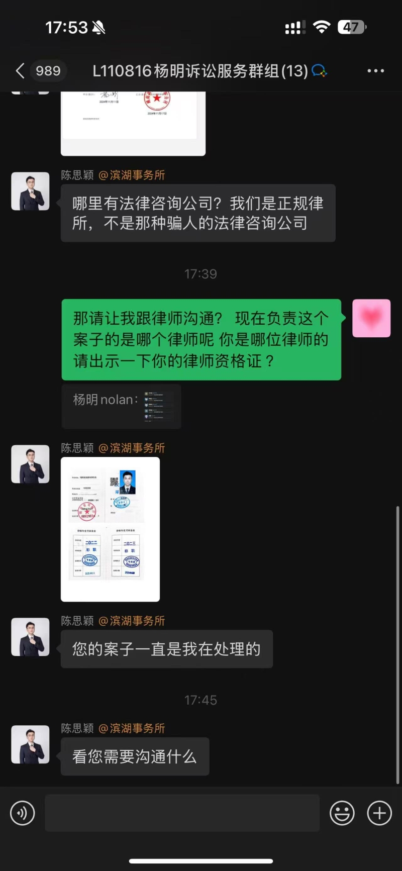 本人姓名:杨明,身份证号“232321****0434”,联系方式:176****1939.本人 之前在网上对接到一家法律服务公司说可以帮忙处理案件,让我签署相关的合同,结果这个公司以法律服务公司名义收到我支付的律师费后,一直没工作,法院也没立案,要求我提供各种文件、缴纳各种费用。我要求退还费用也不退回费用。对接我这个事情的是一个群有十几个人,没有一个律师。最后我要求退费时候,他们说是一个叫陈思颖的律师给我处理这个事情,但是最后也不给我退费,也不处理事情。导致被告被其他人先起诉冻结账户了,我遭受了巨大损失。我经过在全国律师执业诚信信息公示平台查询,陈思颖 律师又担任湖南荣湘律师事务所单位负责人。作为一个普通老百姓,律师收费后不提供服务,有不处理事情,冒用法律服务公司,好几个律所推卸责任,请求司法局严惩。
