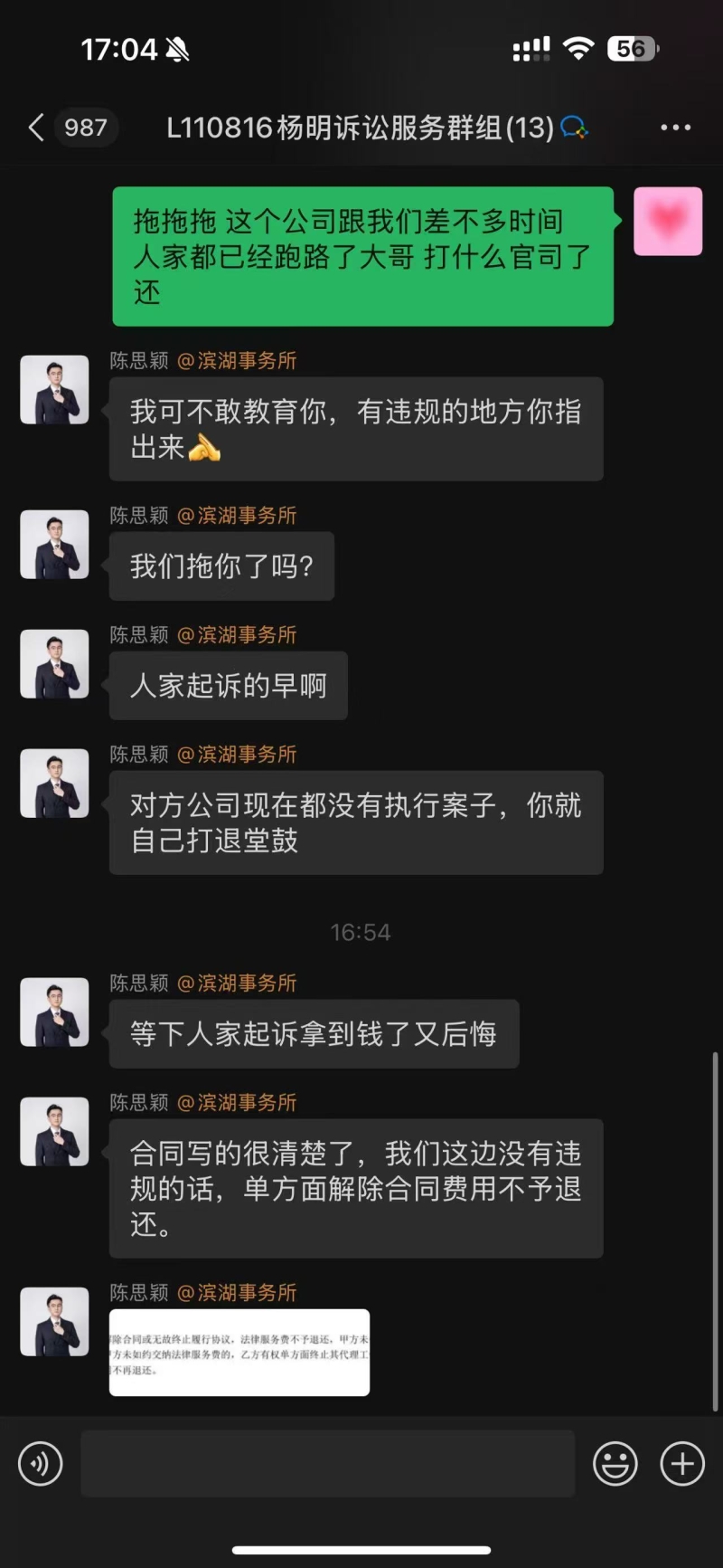 据了解,投诉人因债务纠纷,与湖南滨湖事务所充分沟通后签订了委托代理合同,委托湖南滨湖律师事务所(以下简称“滨湖所”)提供法律服务,处理相关事宜,滨湖所事先告知了当事人诉讼的相关风险,并按约定收取代理费用。滨湖所接受委托后,按合同约定流程办理了相关业务,不存在投诉人所说的不沟通,无进展的情况。为避免纠纷,滨湖所于2月17日与投诉人杨先生友好协商并达成一致退还了部分费用。沅江市司法局于2月17日下午对投诉人进行回访,投诉人对处理结果表示满意。后续我局将进一步加强对律师事务所的管理,进一步规范执业行为,提升服务质量!