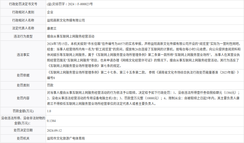 【行政处罚】益阳高新文化传媒有限公司
