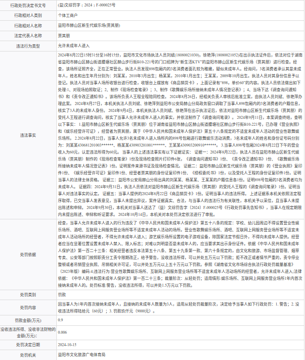 【行政处罚】益阳市赫山区新生代娱乐场(贾其朋)