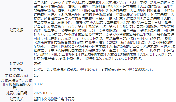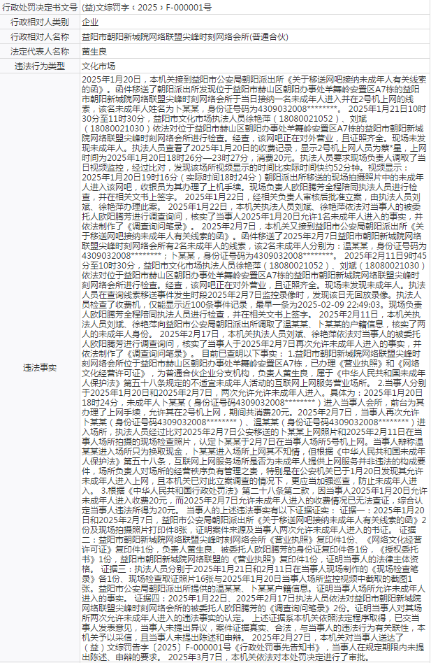 【行政处罚】益阳市朝阳新城院网络联盟尖峰时刻网络会所(普通合伙)