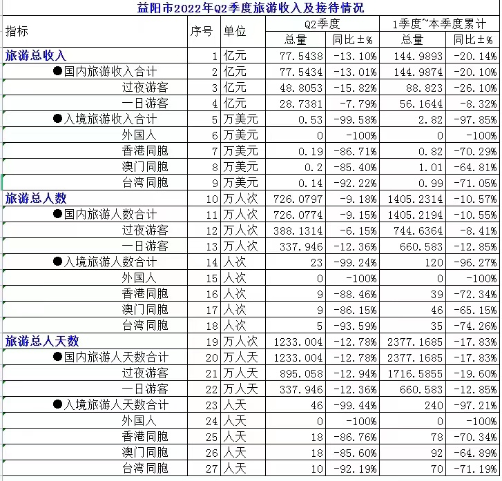 益阳市2022年Q2季度旅游收入及接待情况
