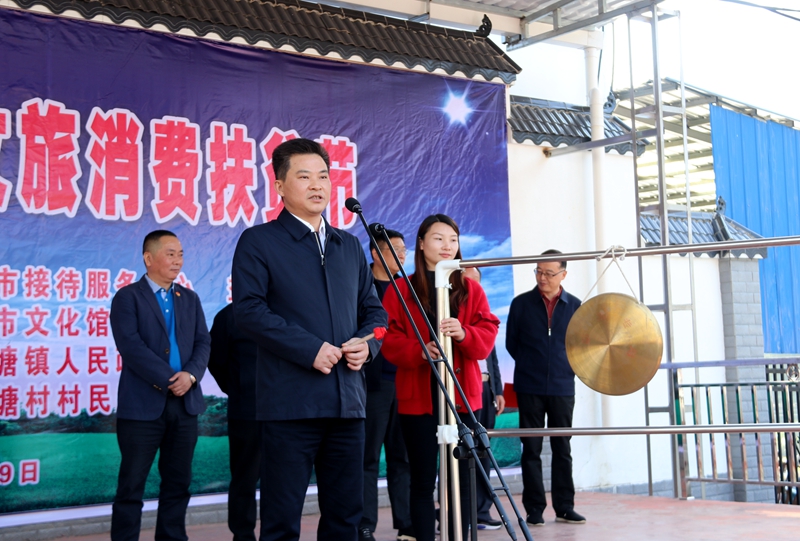 本次活动旨在以文促旅、以旅彰文,通过文旅消费扶贫节的举办进一步畅通当地农副产品销售渠道,不断巩固脱贫攻坚成果,市政协副主席黄仲书出席活动,市委宣传部副部长、市文旅广体局党组书记、局长陶汉文为活动鸣锣,宣布节会开幕,市接待服务中心主任赵梦芳致辞。