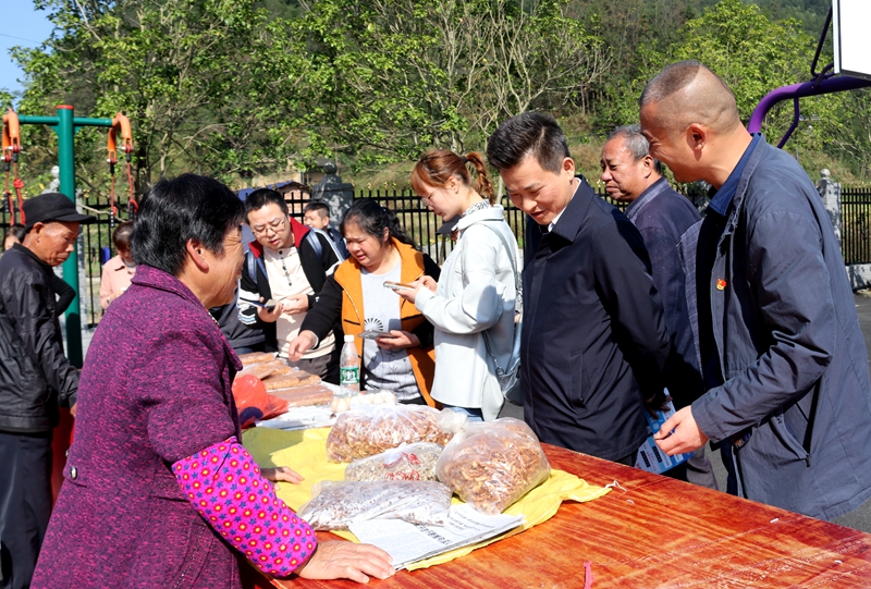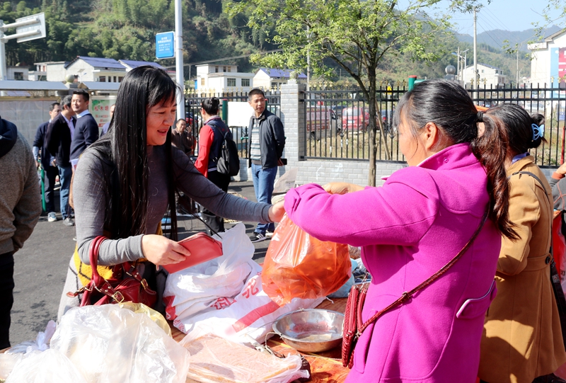 活动现场,共设置蛟湖、枫树坳、上半山、凉水井和飞水岩五大农副产品展销区,采取“嘉宾+销售者”现场购买和订购相结合的模式销售土鸡、土猪、刁子鱼、红薯粉、酸枣片、冬笋等“土特产”,买卖双方公平交易,物美价廉的农副产品很受来自城里消费者的欢迎,不少摊位很快被抢购一空。