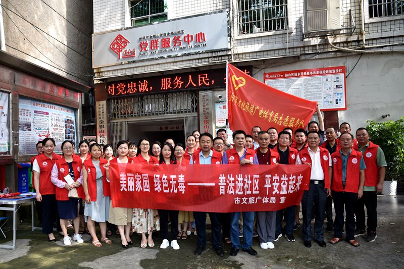 7月7日,市文旅广体局党组成员、副局长徐志成,总工程师汤光泉带队,组织全系统近40名志愿者深入金银山社区开展“美丽家园 绿色无毒——普法进社区 平安‘益’起来”志愿服务活动。