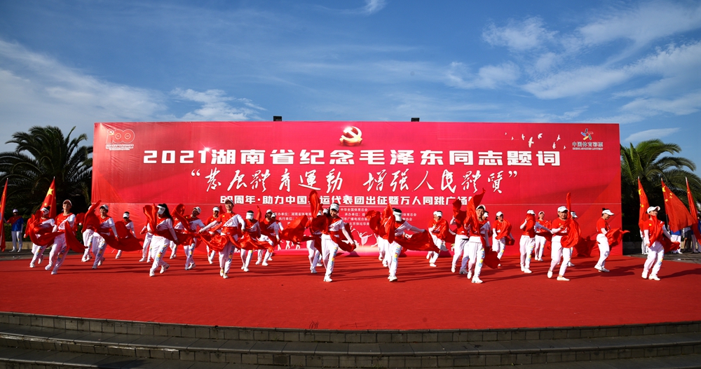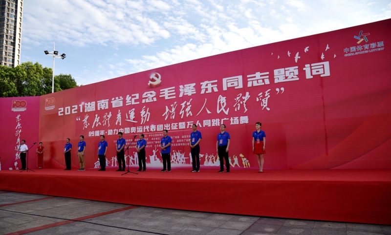 7月11日,2021湖南省纪念毛泽东同志题词“发展体育运动 增强人民体质”69周年•助力中国奥运代表团出征暨万人同跳广场舞活动在益阳佳宁娜广场举行,旨在庆祝中国共产党成立100周年,为奥运健儿加油鼓劲儿,同步助推全民健身活动广泛深入开展。