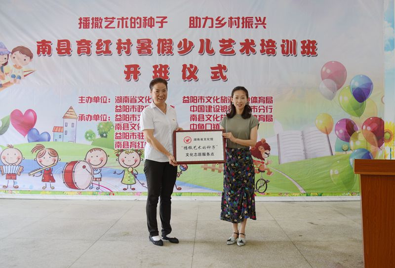 仪式上,志愿者们向参加培训的孩子们赠送了美术、舞蹈用品,省文化馆向育红村颁发了“播撒艺术的种子”文化志愿服务点牌匾。来自育红村完小的欧湘怡同学发言,代表参加培训的学生向志愿者叔叔阿姨们表示感谢。