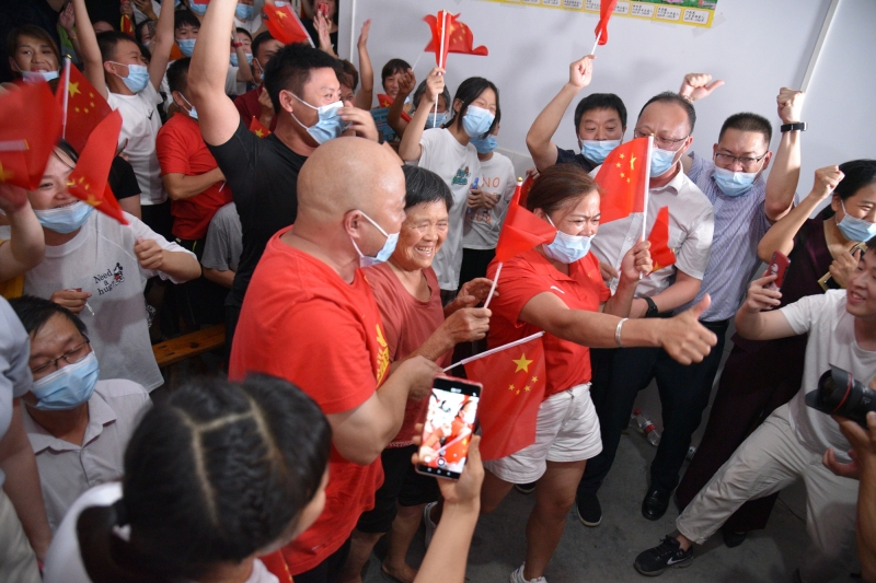 在安化县谌利军老家,其亲朋邻居、启蒙教练及家乡领导在电视机前共同见证了这一激动人心的时刻。