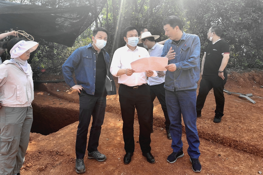 4月11日,益阳市文旅广体局党组书记、局长卜永强率文物保护科、行政审批改革科、市文物考古研究所等单位相关负责人赴长安益阳发电有限公司三期项目工地看望慰问省考古所工作人员,并现场调度考古发掘工作。