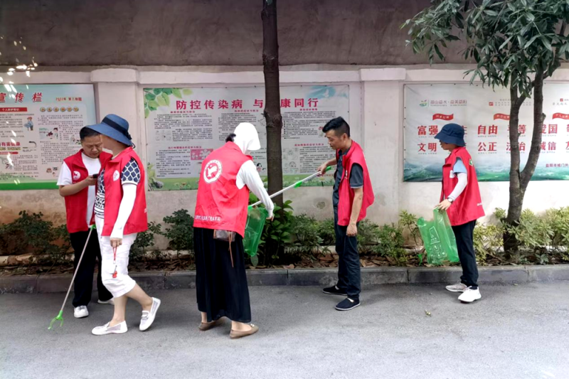 活动中,志愿者们身穿红马甲,给居民发放垃圾分类知识宣传单,详细讲解可回收垃圾、生活垃圾、有害垃圾、厨余垃圾的具体分类等知识,指出社区一些不规范的垃圾投放问题,倡导居民从自身做起,树立生态文明理念。随后,志愿者们清理了绿化带和路面的垃圾、杂物,清除了楼道内的牛皮癣。
