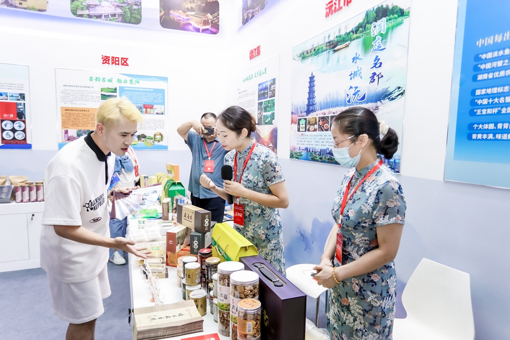 在每个展位上,各单位和企业精心挑选了具有本地特色的产品予以推介。益阳展区人气旺盛,一大波网红达人逐个展位巡展直播,直播平台大量粉丝围观发言,起到了良好的宣传推介效果。在企业展区,博恩新材料有限公司展出的“星云舰·文旅仓”旅游民宿产品设立在博览会现场入口位置,展现了益阳民宿设施设备建造水平。