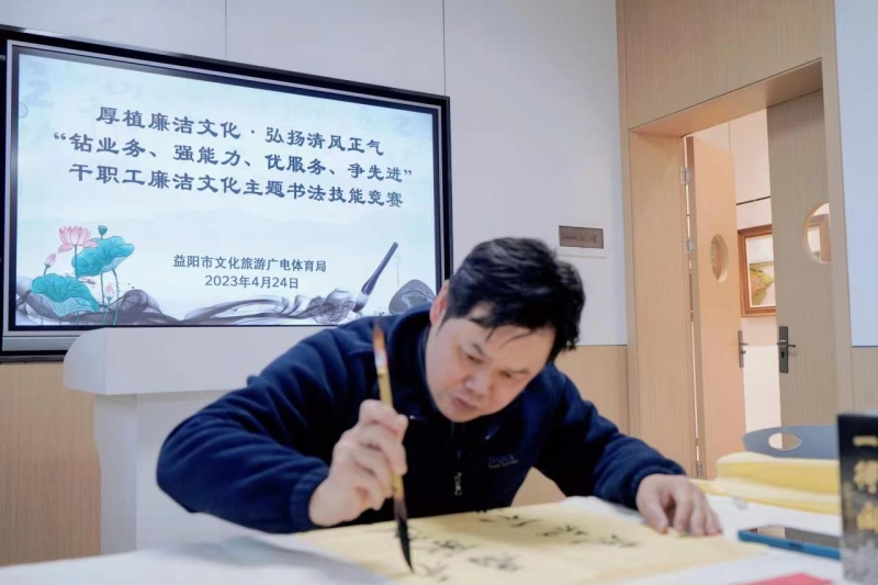 4月24日,市文旅广体局组织开展“厚植廉洁文化·弘扬清风正气”“钻业务、强能力、优服务、争先进”干职工廉洁文化主题书法技能竞赛,44名选手报名参赛。活动旨在深入贯彻市委、市政府关于开展“执行力提升年”“能力素质提升年”“营商环境提升年”行动部署,促进廉洁文化与中华优秀传统文化深度融合,不断推动系统党风廉政建设。
