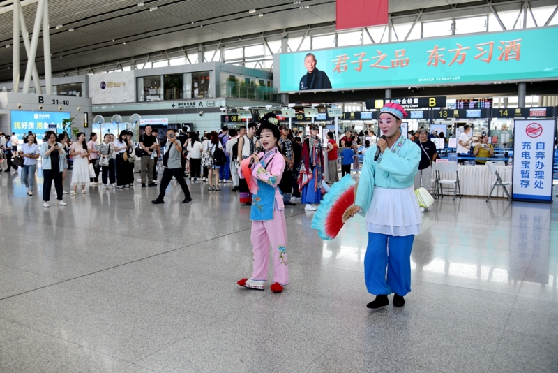 活动现场,南县地花鼓、益阳弹词、茶马古道祭祀舞蹈、《竹海幻境》演出片段等节目连续巡演15场,精彩纷呈的表演吸引众多旅客驻足欣赏,大家流连忘返,纷纷称赞。现场设置的8个文创产品、旅游商品展台以及精品旅游线路、景区宣传展板前人气高涨,旅客纷纷前来了解益阳旅游资源,沉浸式感受益阳人文魅力。来自天津的旅客张女士表示,原本只是在长沙转机,却被安化黑茶“圈粉”,已计划今年中秋节假期带家人来安化茶马古道游玩。