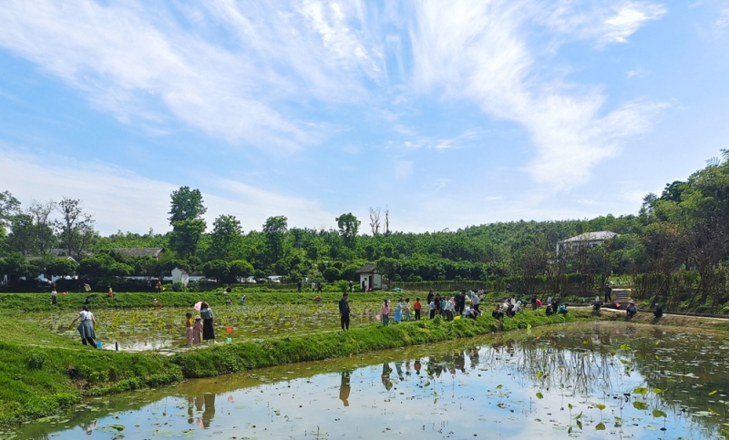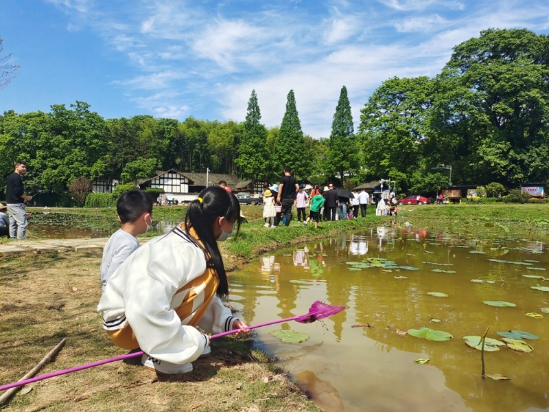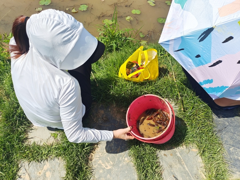 故居前的荷塘边,小朋友在家长的陪同下在塘边找乐子,手拿标配小网子和桶,再配上一根棍子、绳子和肉块,一个简易的钓龙虾工具就算完成。挂上诱饵,静待小龙虾上钩。钓到龙虾,孩子们欢呼雀跃乐此不疲,享受刺激和快乐。家长们则坐在荷塘边,负责孩子安全的同时,架起“长枪短炮”,记录孩子们童真的一刻。