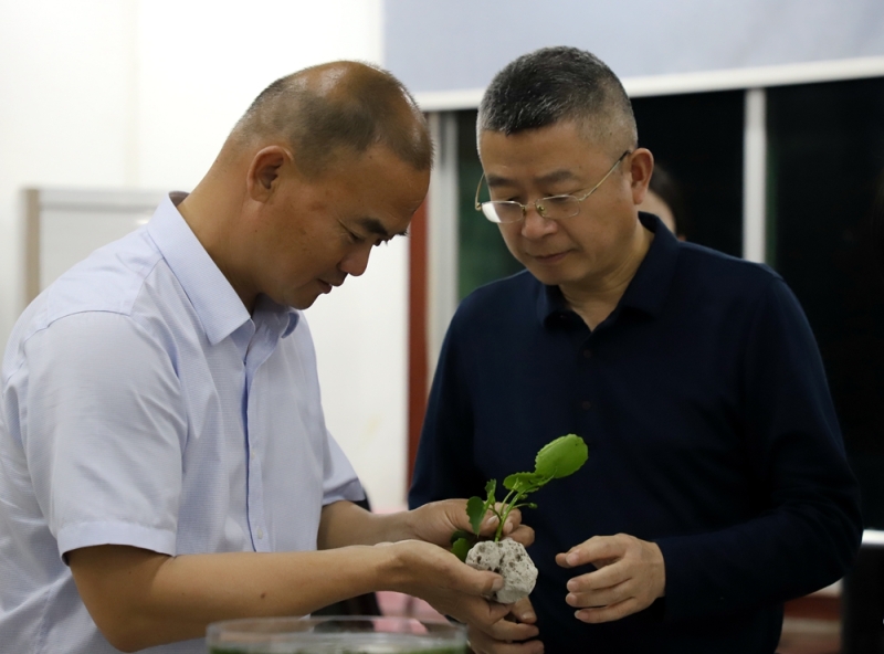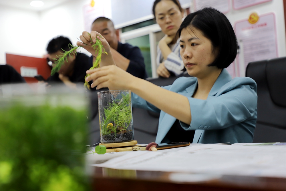 5月17日,四面水草环抱的水生植被产业示范园迎来了20多位文旅志愿者。在大通湖区生态投资有限公司副总经理史少文的指导下,志愿者们正在认真学习着一整套的水草微景观制作工序。