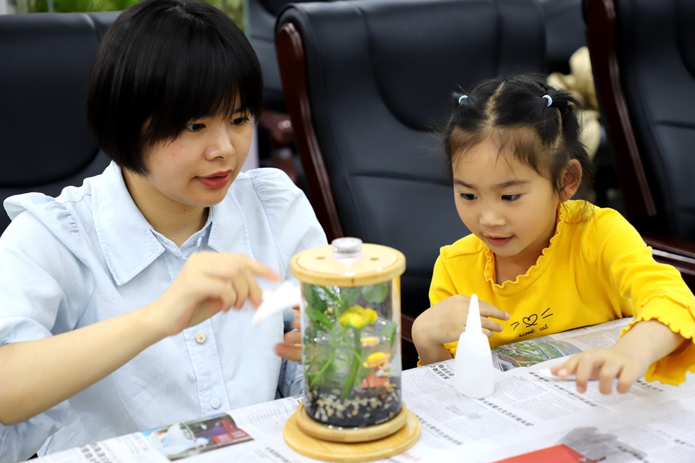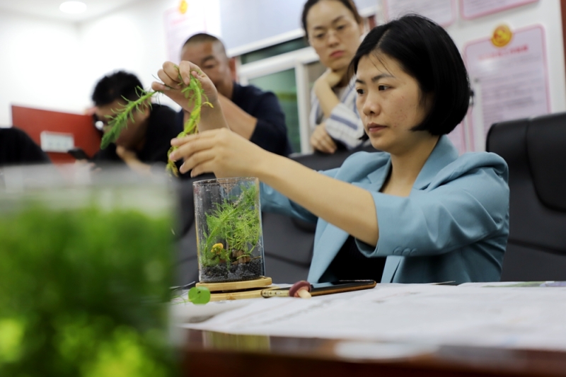 活动现场,志愿者们利用大通湖生态治理成效的苦草、轮叶黑藻等沉水植物和点缀景观的铜钱草、金鱼藻等植物,配合造景的装饰配件进行文创产品制作。不一会,一件件美观、可爱的作品就陆续“出炉”。“这是我第一次接触水草造景,感觉非常有趣,我要将自己亲手做的作品带回去送给我女儿”,志愿者谷晴说。